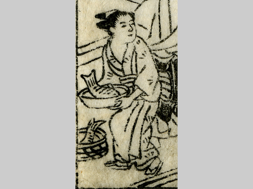 | 解説 | 大津市石場 湖魚料理 石場は琵琶湖対岸の矢橋(草津)までの舟運の拠点でした。 「やつま屋」では、旅人に料理を振舞っていました。 当時大津では、フナやコイがたくさん獲れました。 店の女中が運んでいるのは湖魚の焼き魚でしょうか。 |